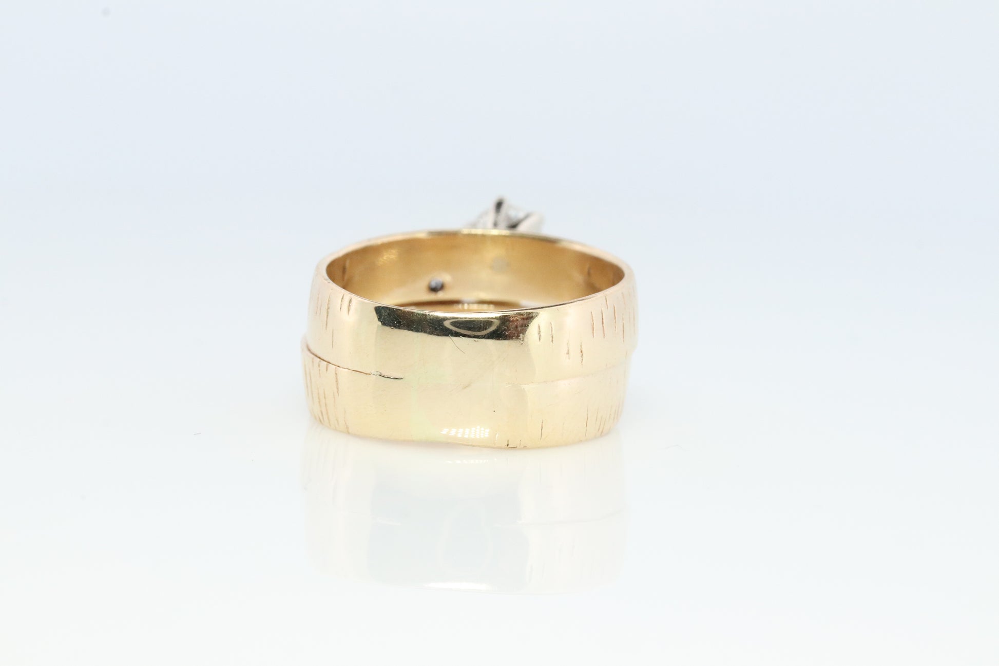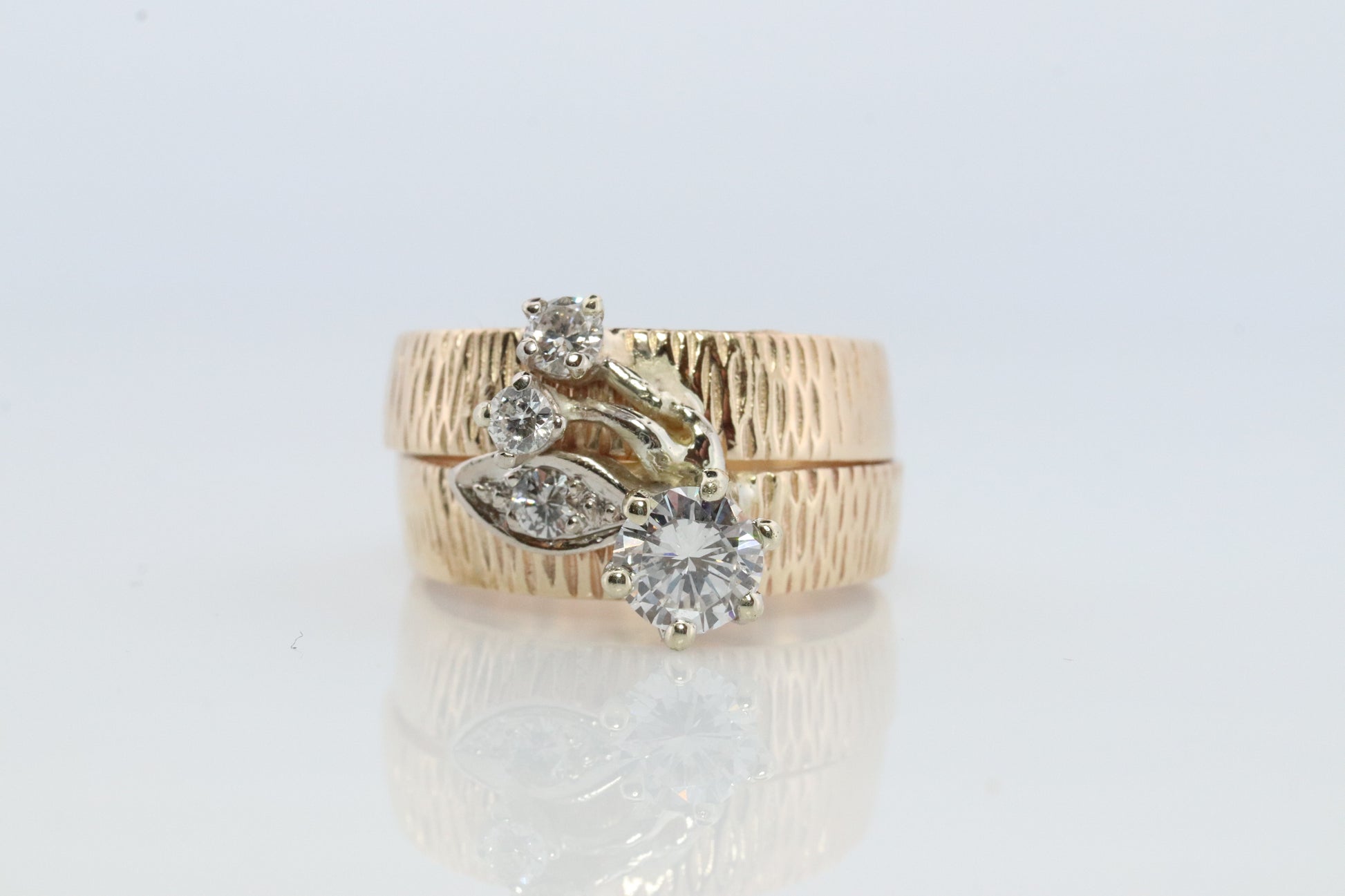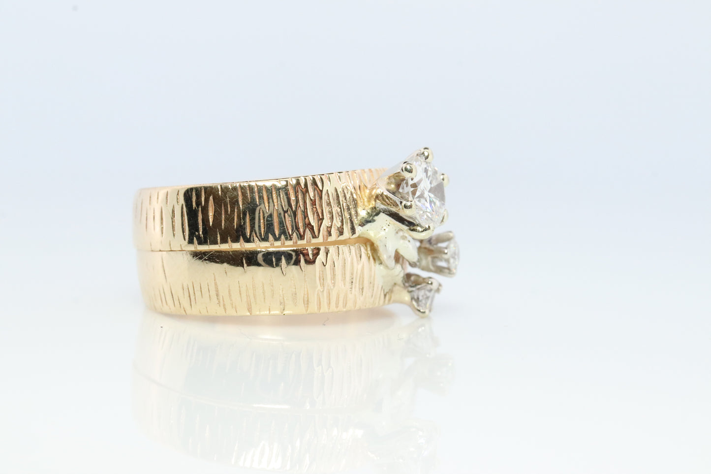 14 Karat strukturiertes Gelbgold. Die Ringe sind am Schaft angelötet, können aber bei Bedarf leicht getrennt werden. Die Diamanten sind in einer Ranke eingefasst, die sich vermischt