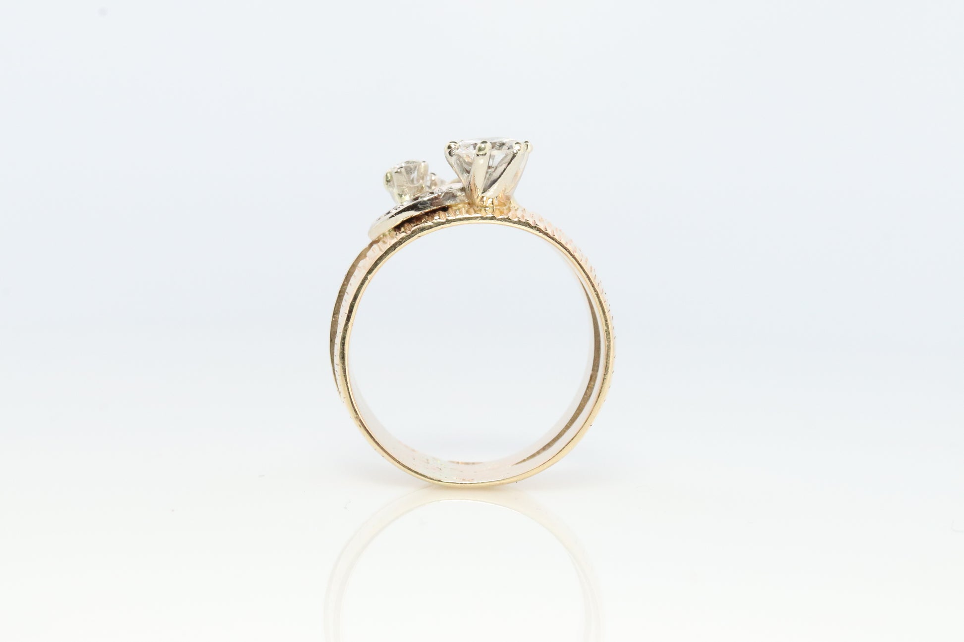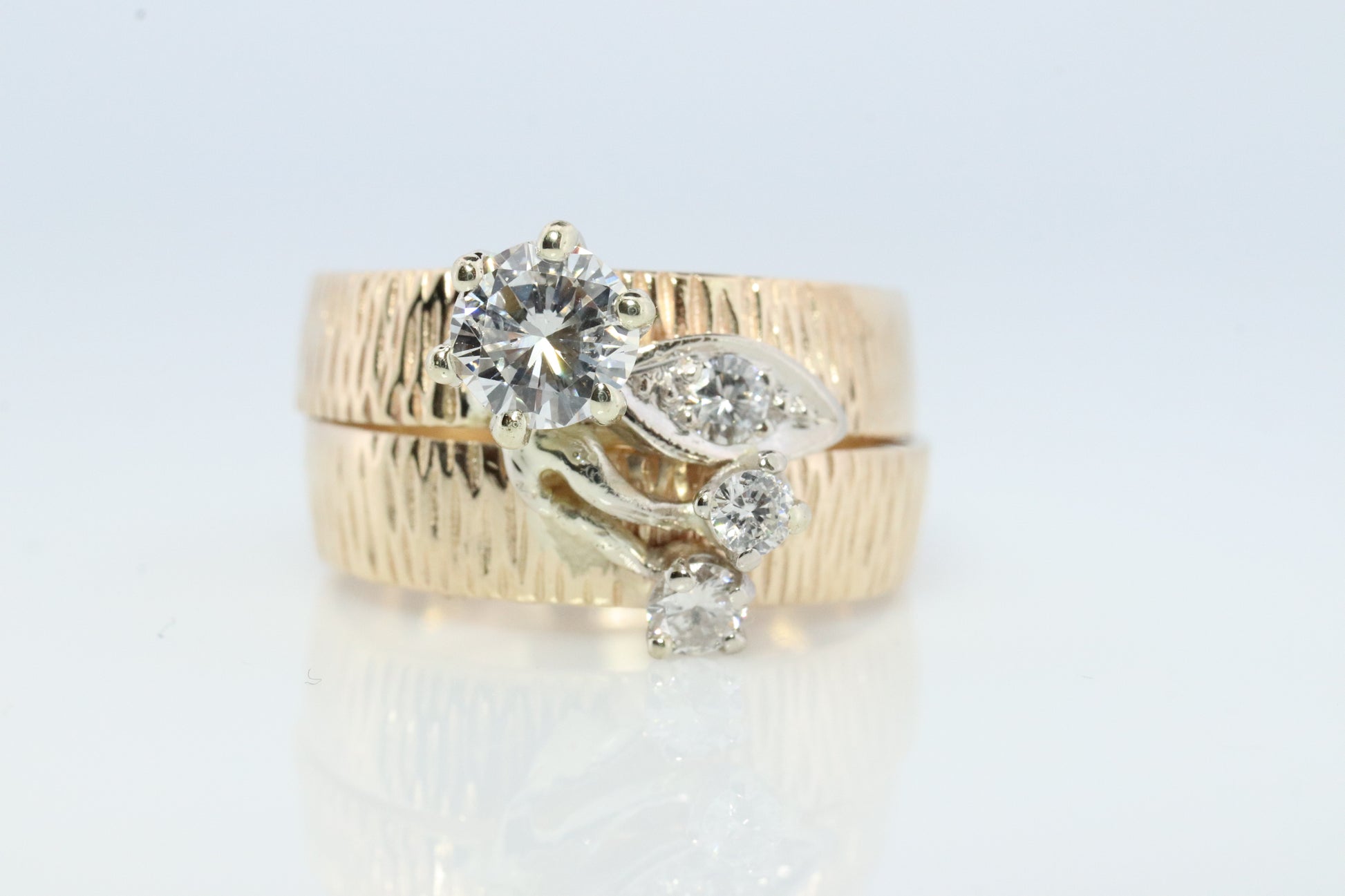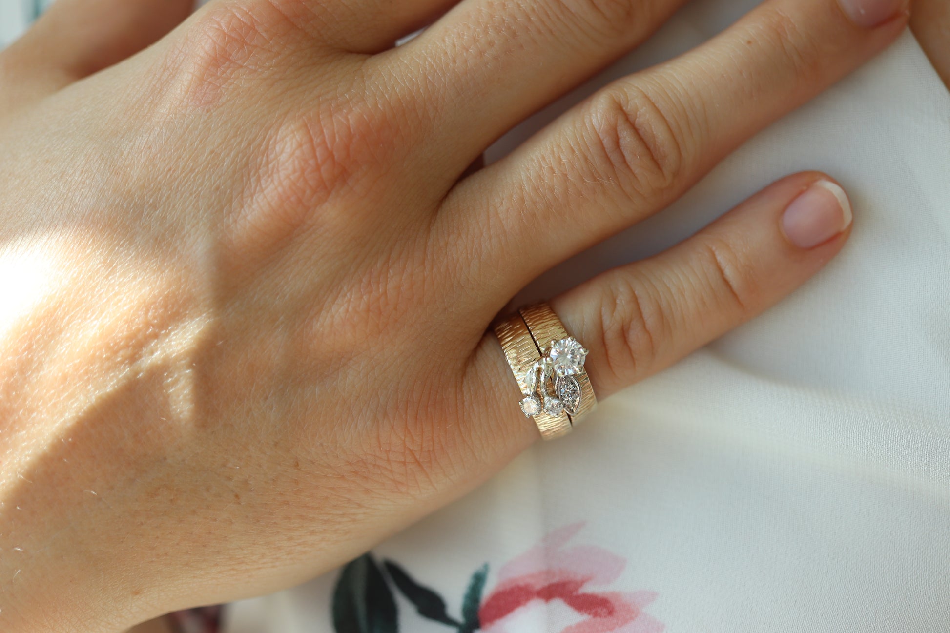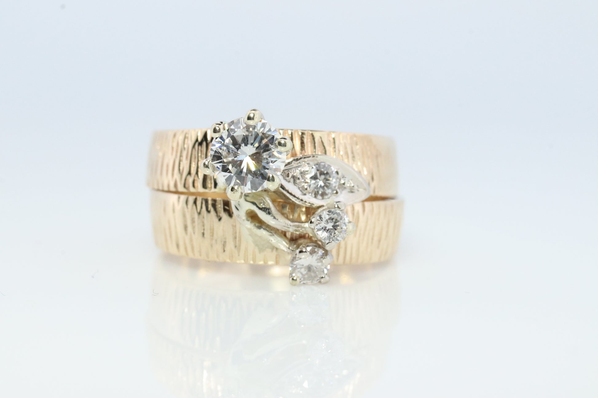 14 Karat strukturiertes Gelbgold. Die Ringe sind am Schaft angelötet, können aber bei Bedarf leicht getrennt werden. Die Diamanten sind in einer Ranke eingefasst, die sich vermischt