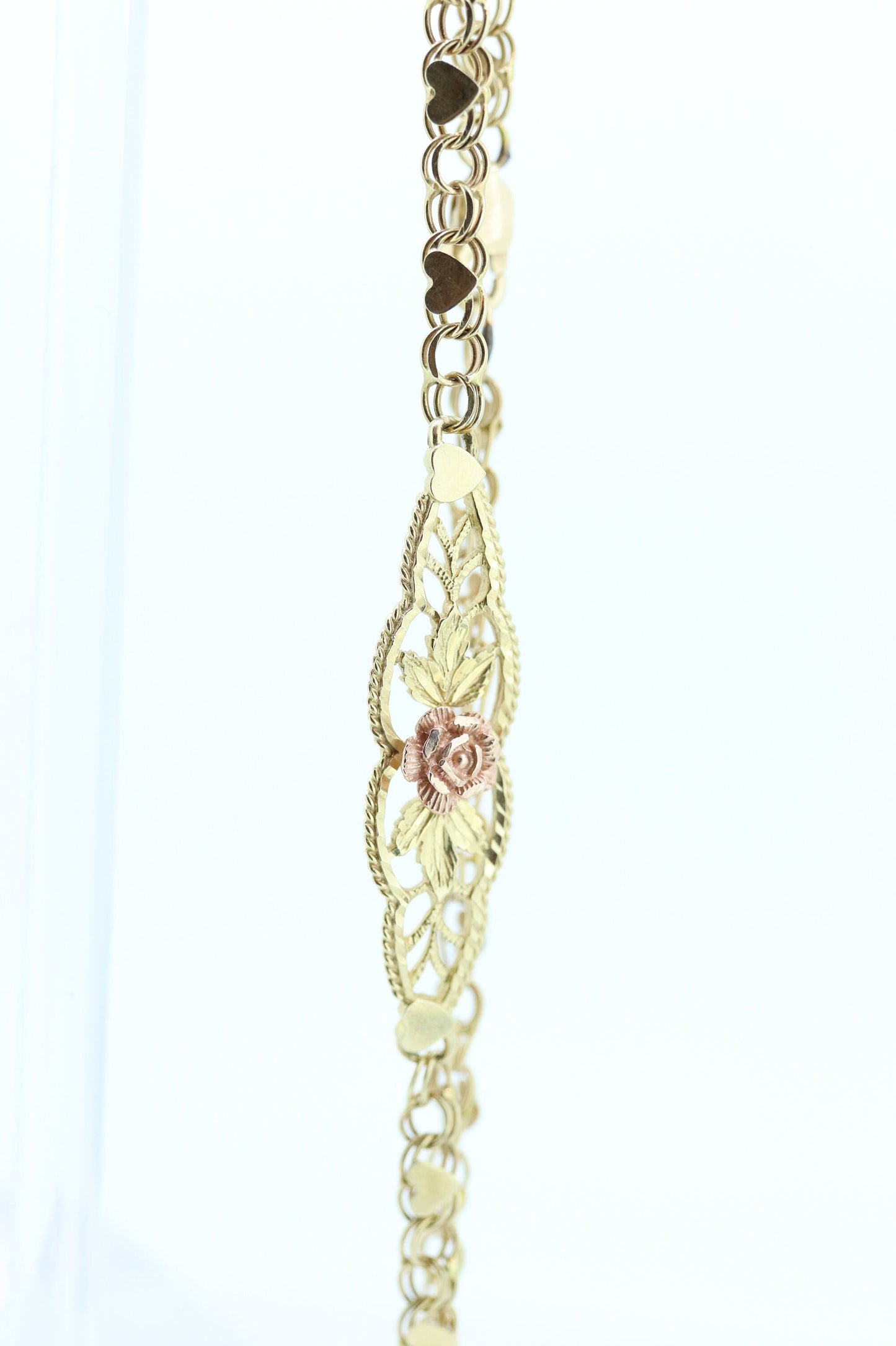 Filigranes Schildarmband aus 14-karätigem Blumenrosen-Schild. Filigranes, offenes Schildarmband aus 14-karätigem Gelbgold mit Herzgliederkette. st(113)