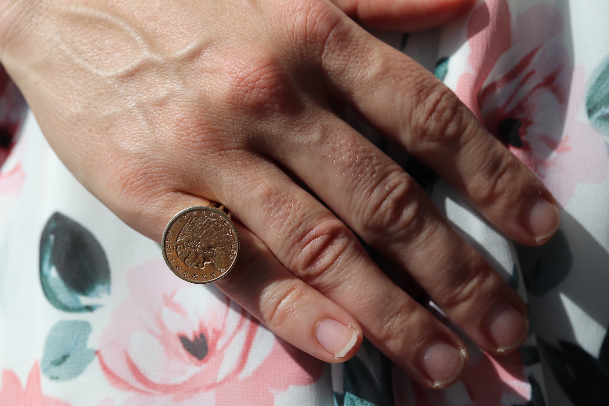 Ring aus 14-karätigem Gold mit einer Lünette aus 22-karätigem 2,5-Dollar-Münzen-Indianerhäuptling von 1908. Lünettensatz Siegelmünzenring.