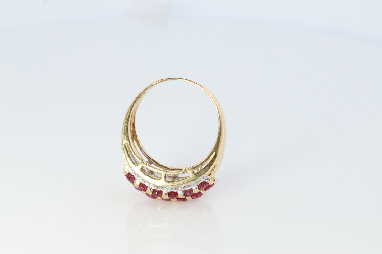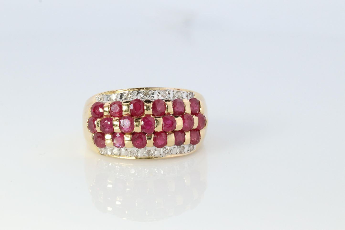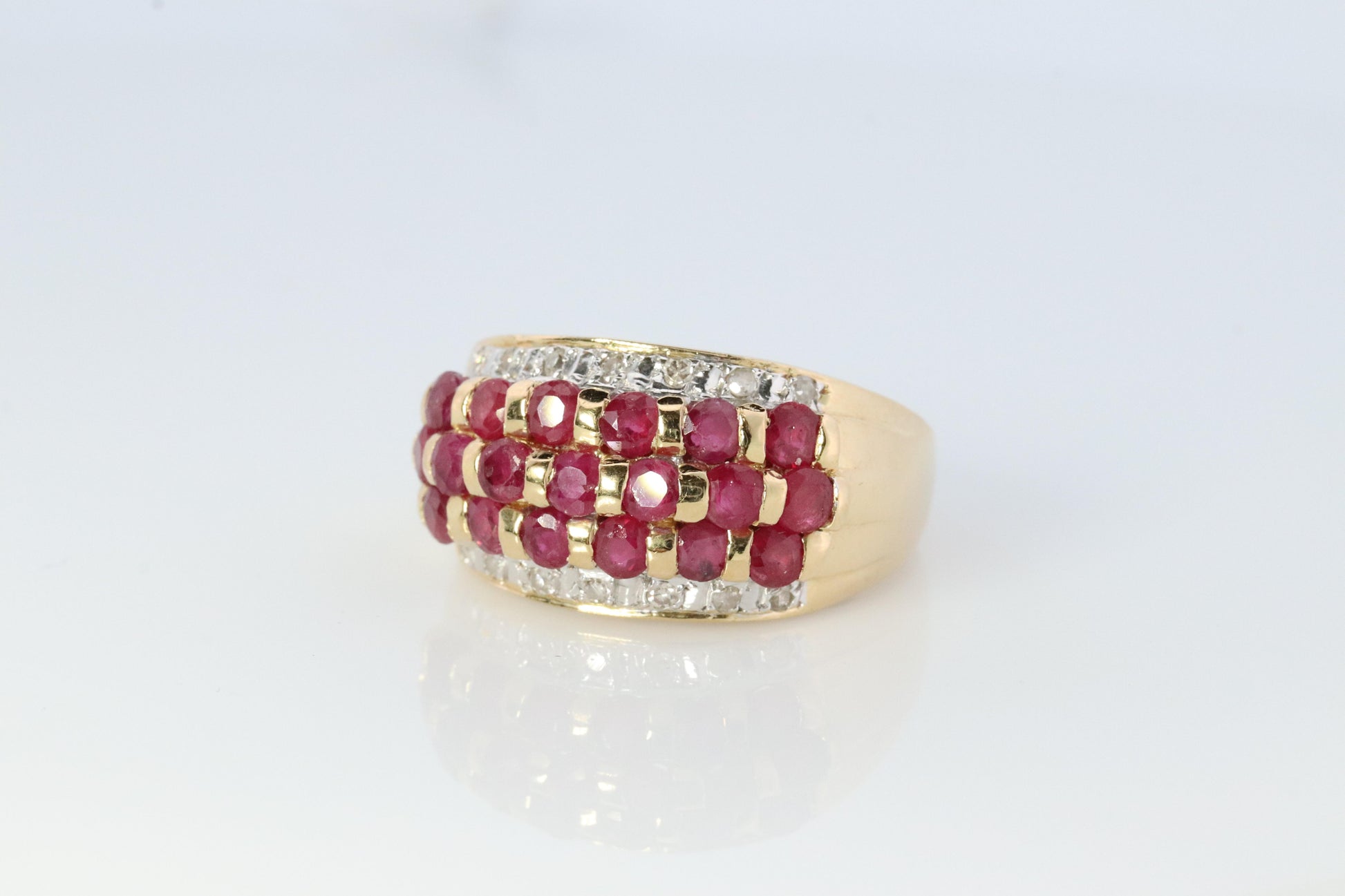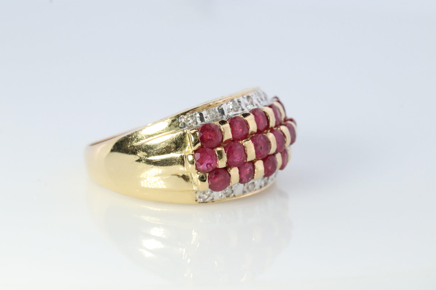 14k Ruby and Diamond Wide Cluster Encrusted ring. 14k Yellow Gold and diamond