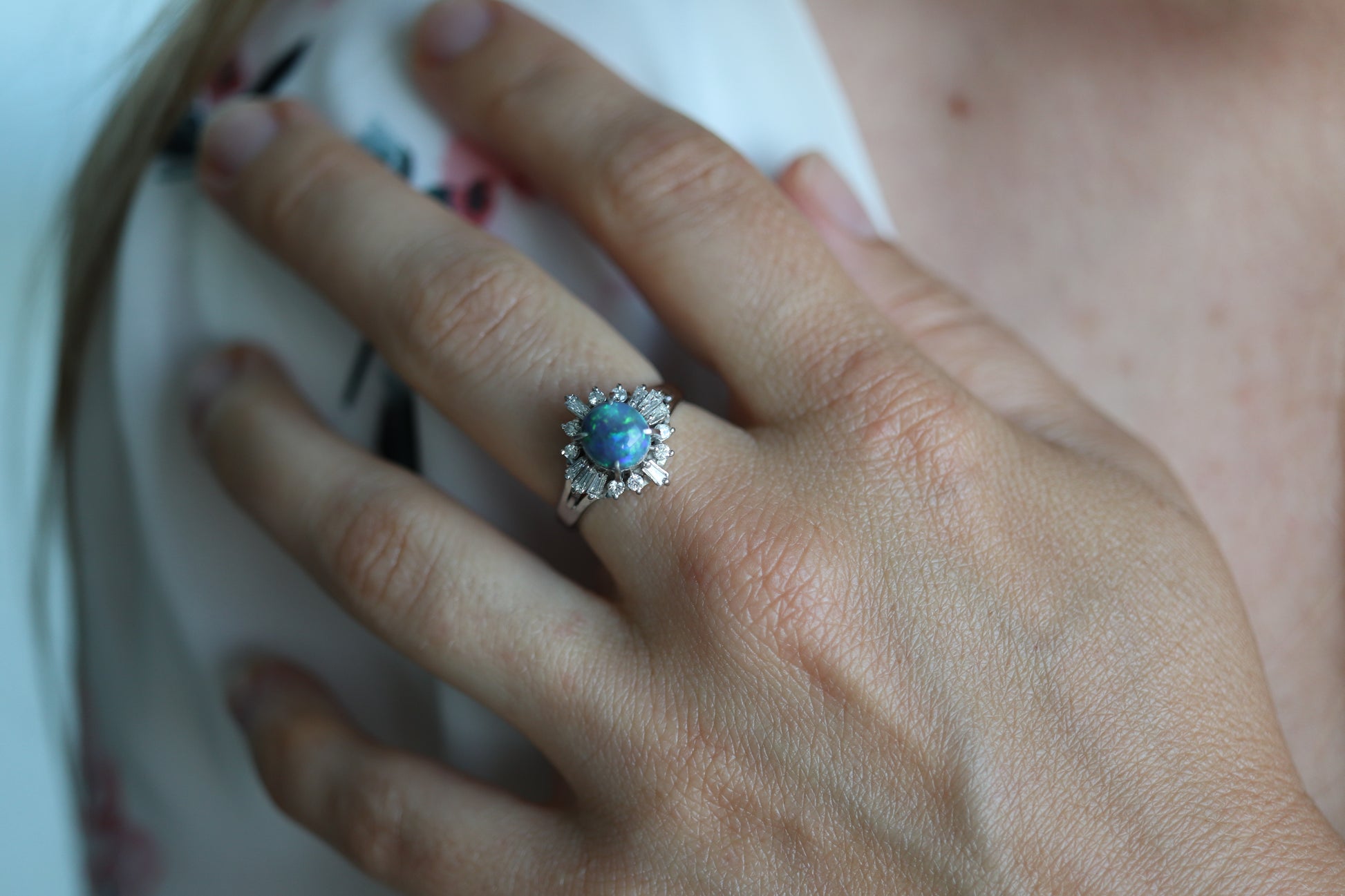Black Opal Diamond Ring. 900 Platinum Black Opal Diamond Ballerina Ring. Genuine Australian Black Opal Cabochon.