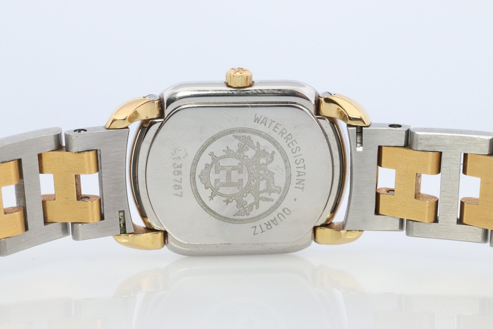 This is an authentic HERMES Stainless Steel 21mm by 29mm Rectangle Rallye Quartz Watch White. The watch is crafted of stainless steel and features a champagne dial, gold hands and hour markers, two tone link bracelet, sapphire crystal, and a quartz movement.