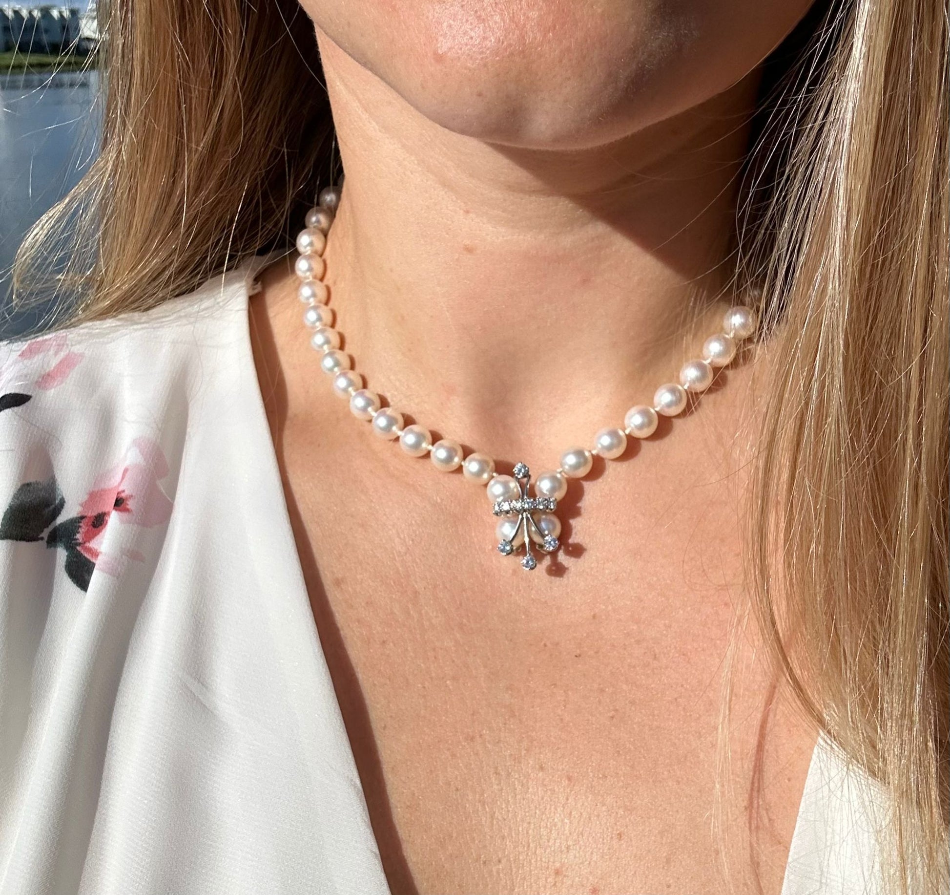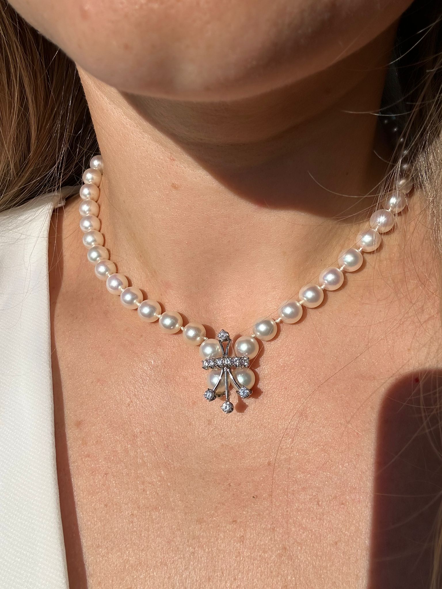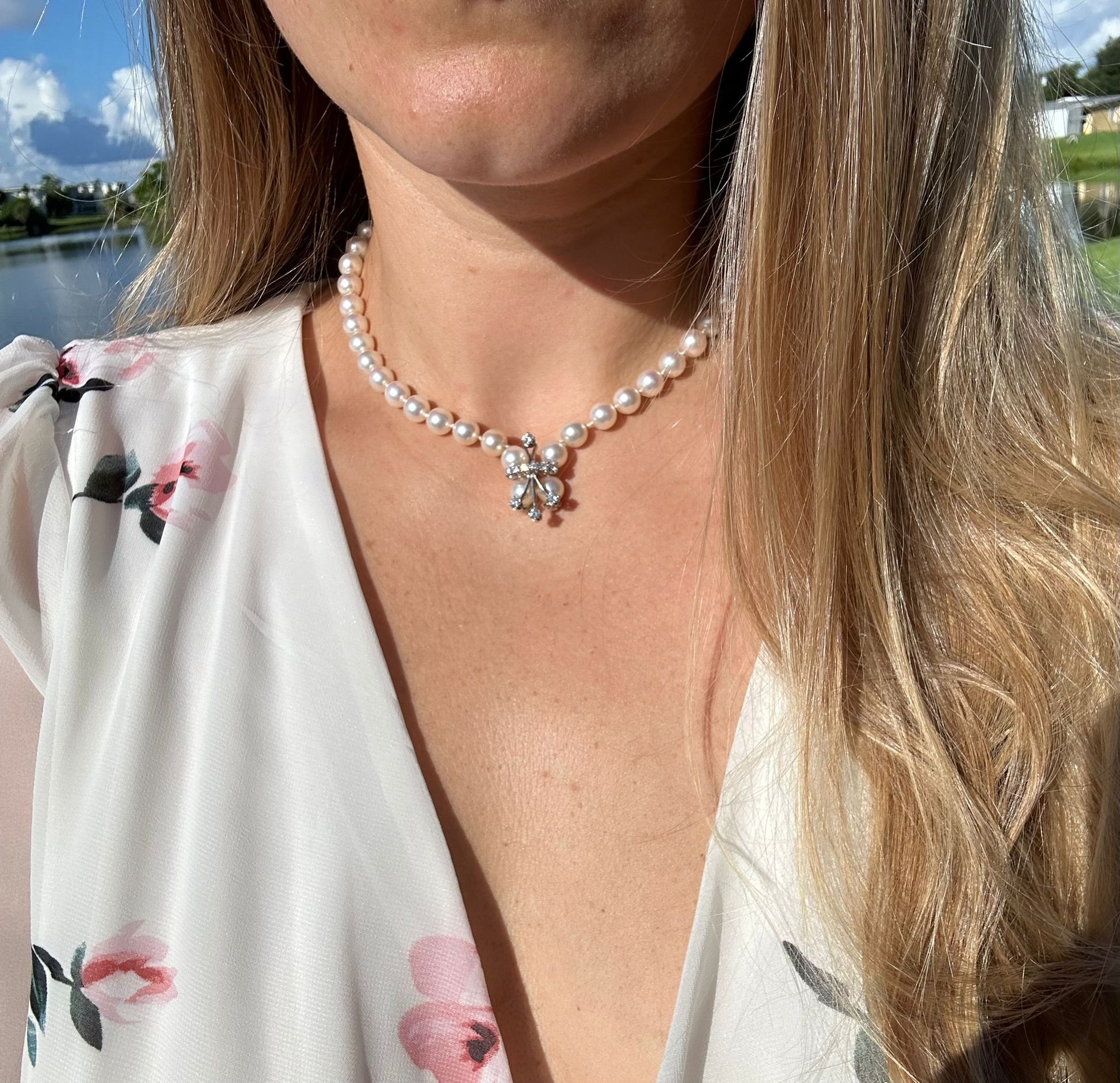 JABEL Diamond 18k White Gold Pearl Necklace. 8mm Pearls 15inch Bypass Chocker Necklace.