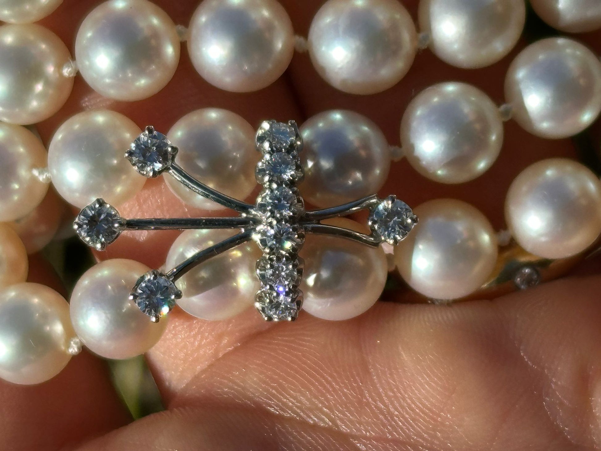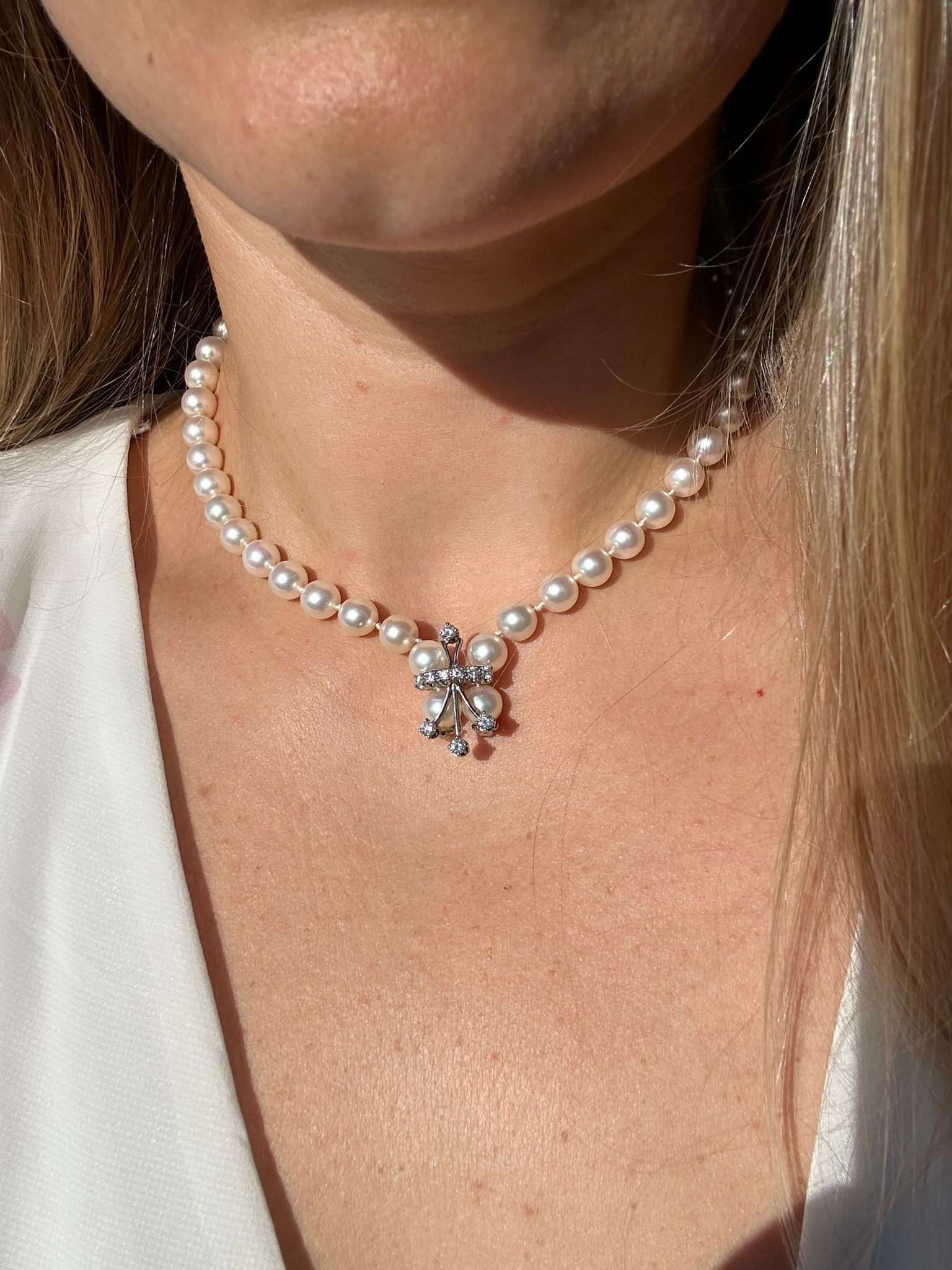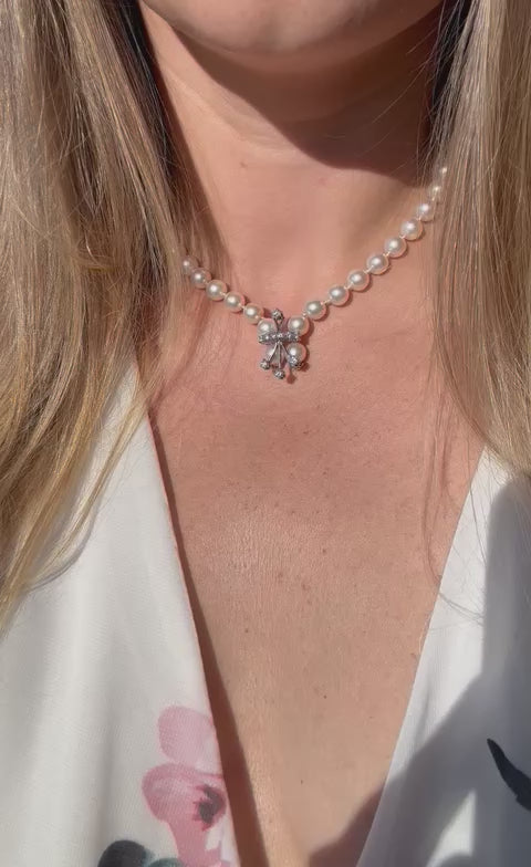 JABEL Diamond 18k White Gold Pearl Necklace. 8mm Pearls 15inch Bypass Chocker Necklace.