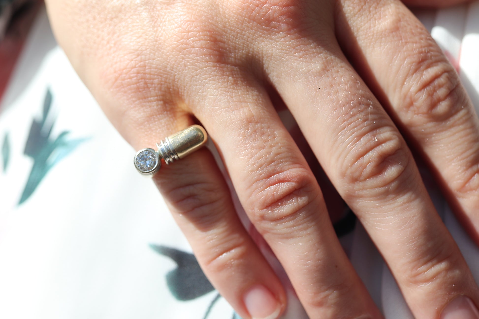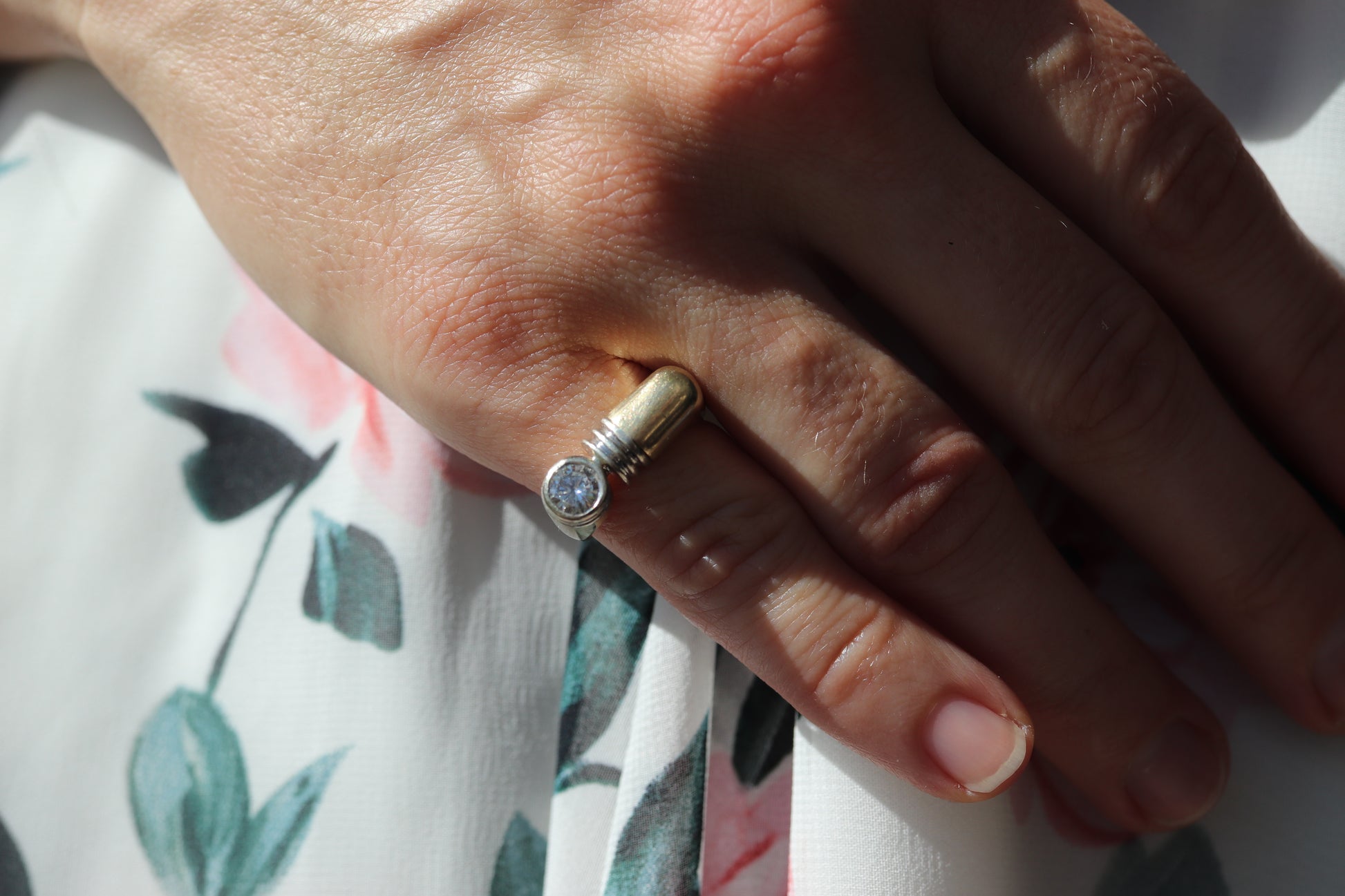 Very unique Men's or Women's ring/band. Solitaire diamond set into signet style ring. Will look spectacular when worn on a pinky.