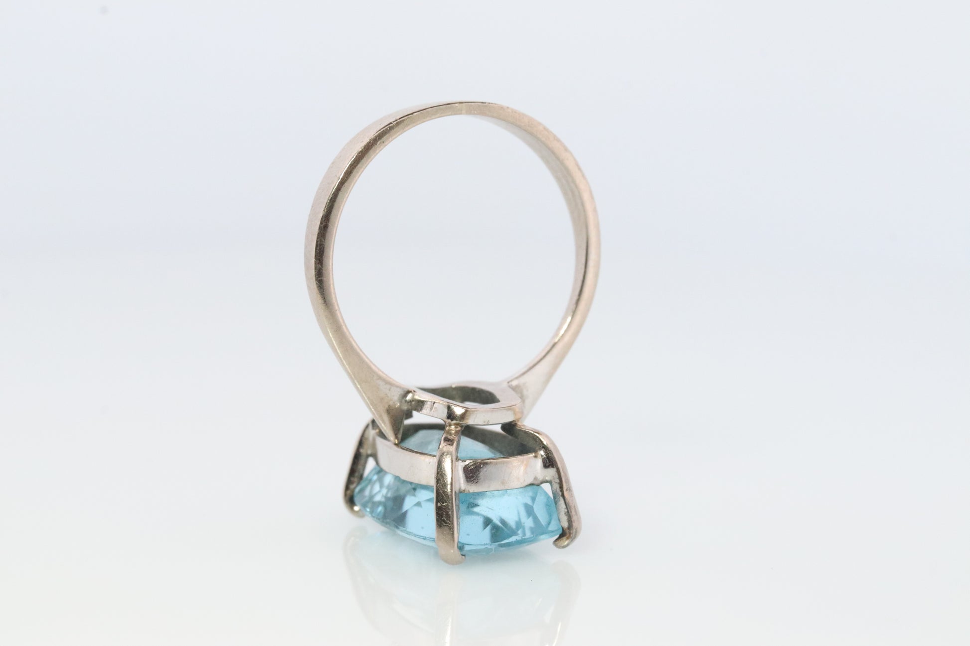 Large Emerald cut Aquamarine solitaire. High prong setting letting in any light available in the room. The aquamarine is a light color gem. It stands at 8.48cts. Pictures do not do this beauty justice. This is the piece to impress.
